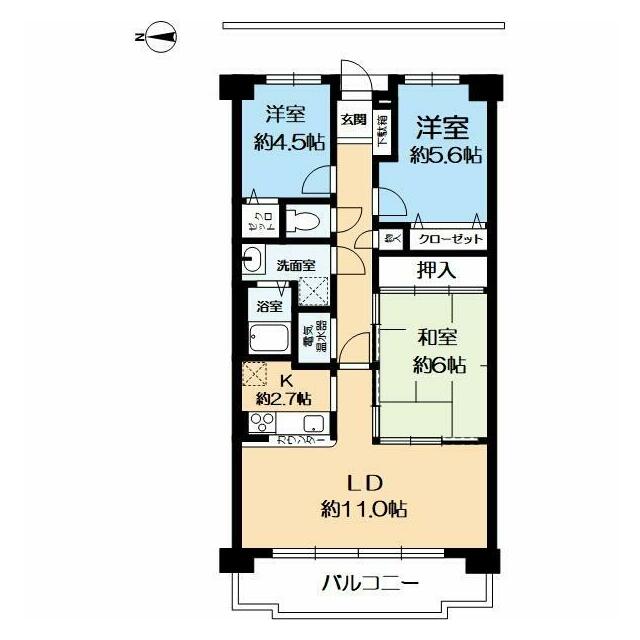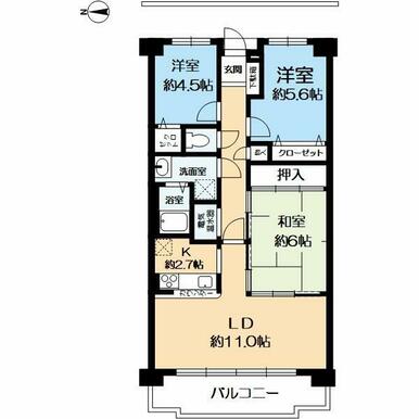 | 間取り(内訳) | 3LDK(LD11、K2.7、和6、洋5.6、4.5) | ||